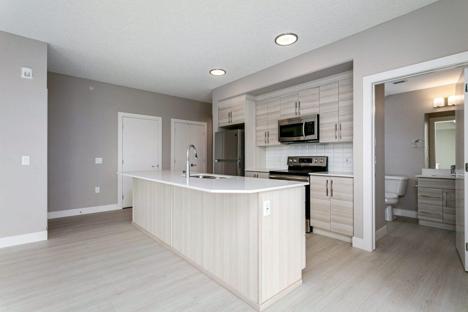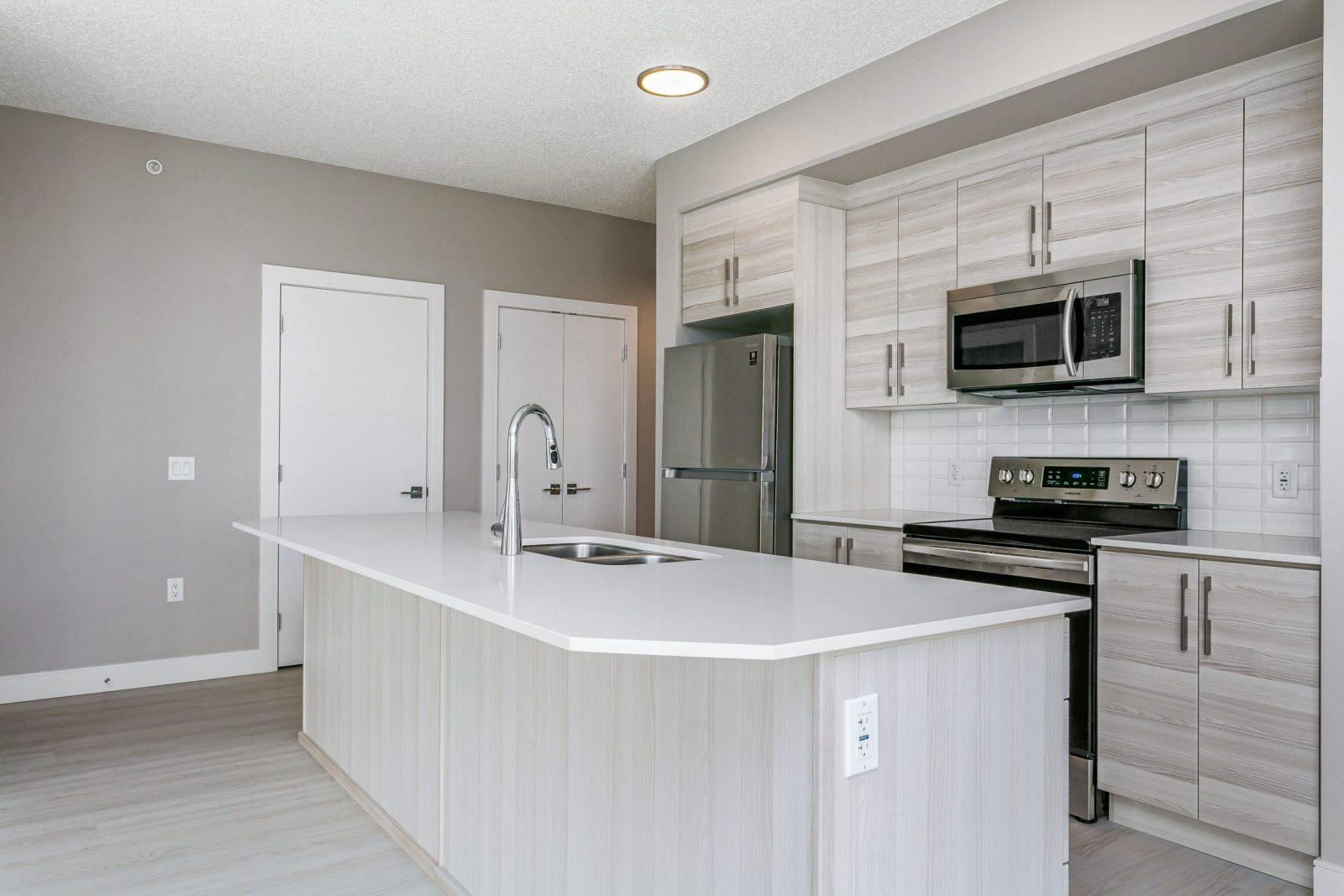 - Quartz countertops with large kitchen islands